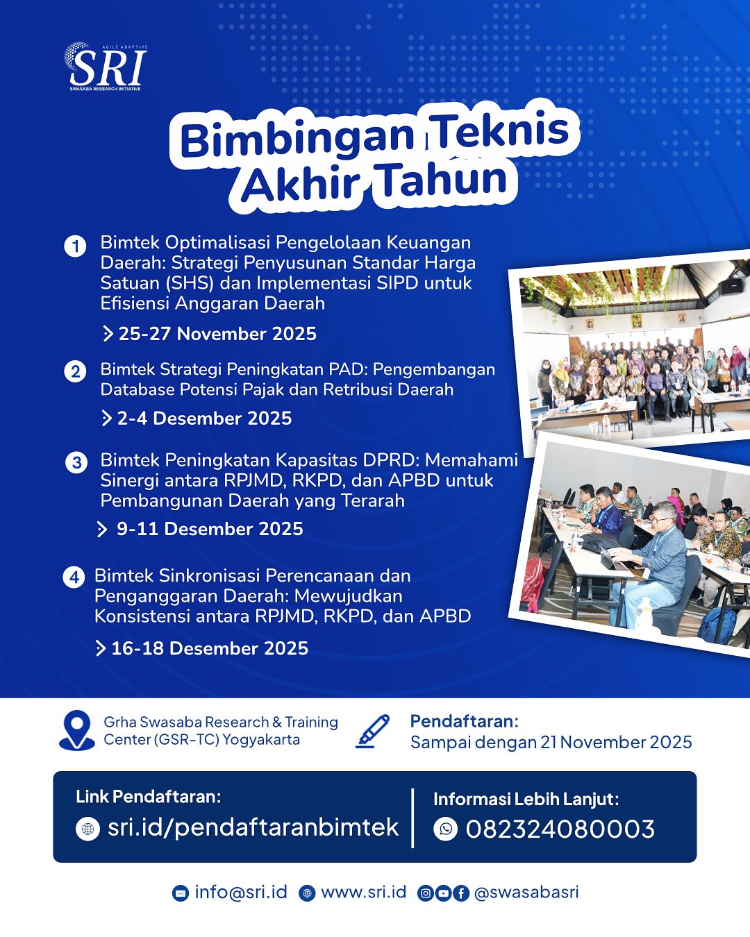 Swasaba Research Initiative (SRI) kembali menghadirkan rangkaian Bimbingan Teknis (Bimtek) di penghujung tahun 2025, dengan topik-topik strategis untuk memperkuat tata kelola pemerintahan dan pengelolaan keuangan daerah. Beragam materi yang kontekstual dengan dinamika terkini, disampaikan oleh narasumber berpengalaman dari kalangan akademisi dan praktisi, telah kami siapkan untuk mendukung peningkatan kapasitas aparatur pemerintah daerah. 📍 Lokasi: Yogyakarta🗓️ Read more