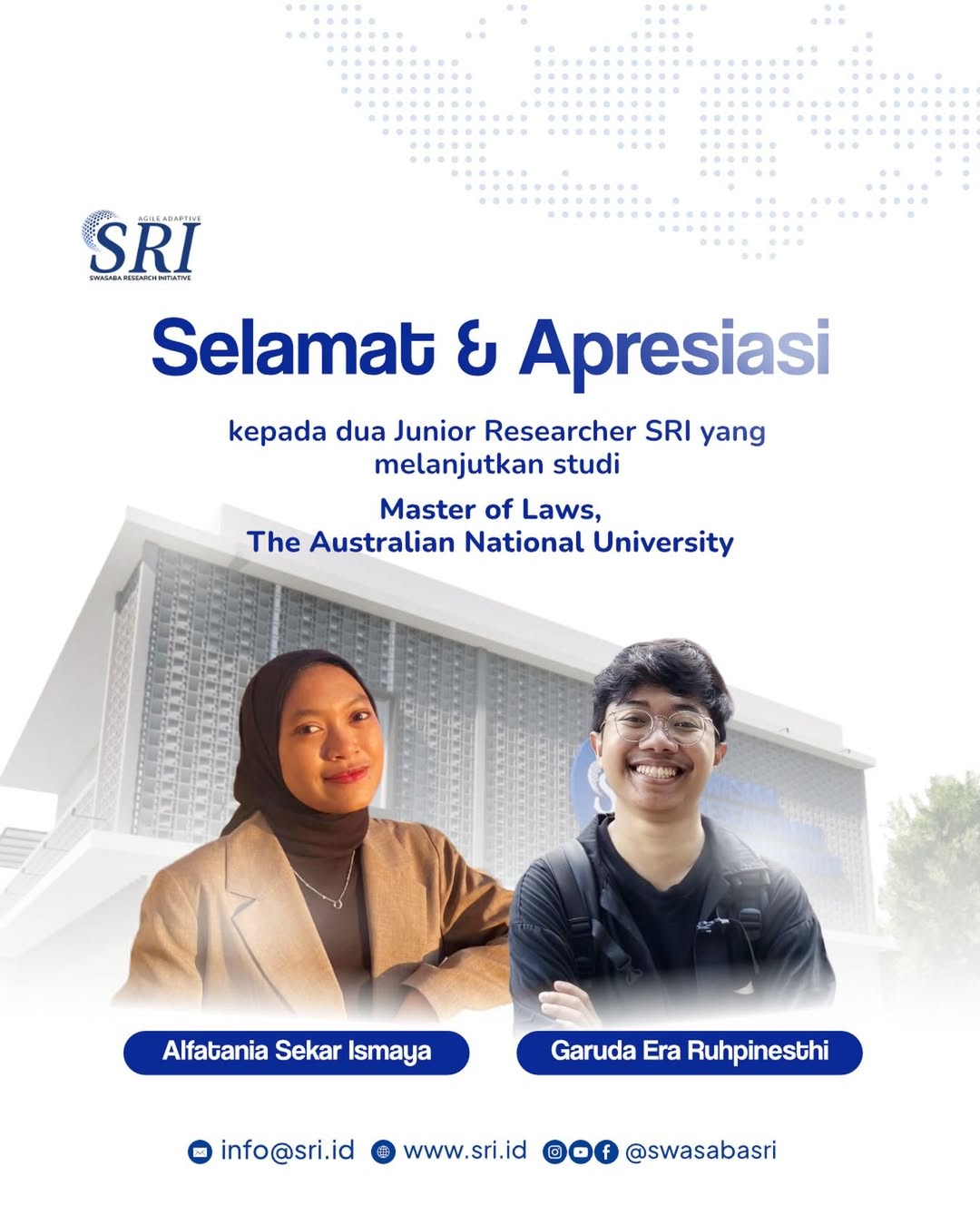 KELUARGA besar SRI kembali mendapatkan kabar membanggakan. Dua junior researcher SRI berhasil mendapatkan beasiswa untuk menempuh studi Master of Laws, The Australian National University. Capaian ini semakin menguatkan komitmen SRI sebagai tempat tumbuh kembang intelektual dan jejaring yang penuh manfaat bagi semua anggota tim maupun para mitra.